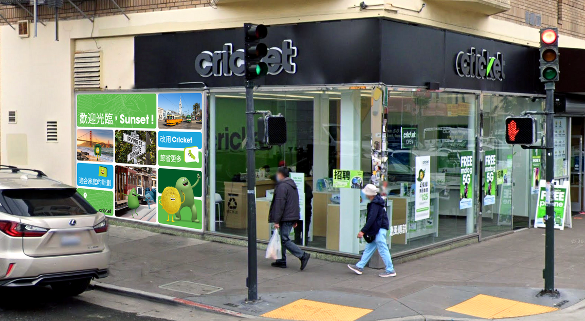 Build a custom large format graphic covering one third of the storefront window at Cricket’s Irving St. location in San Francisco. Incorporate messaging written in Mandarin to make the store feel like an organic part of the Sunset neighborhood.